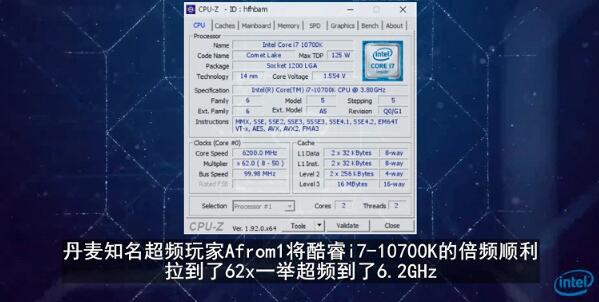 尽管八核Intel Core i7-10700K处理器不是该系列的旗舰产品,但首先,它在用户中非常受欢迎,其次,它具有良好的超频潜力。因此,绰号为Afrom1的丹麦超频器设法将Core i7-10700K超频到了令人印象深刻的6.2 GHz。为此,用户使用了标准的冷却系统-LSS-而不是极端的液氮系统。