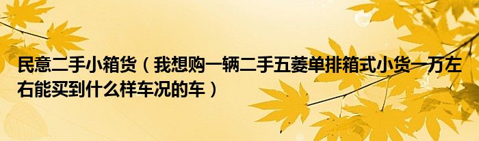 1,我想购一辆二手五菱单排箱式小货一万左右能买到什么样车况的车:2011年哈飞民意货车如果没有发生过大的事故,手续没有问题,车子没有泡过水的情况下应该在1万2、3左右,具体看实际车况。