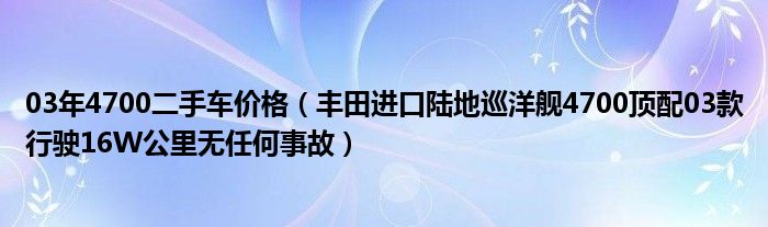 2,本人有一辆2003款的丰田4700能卖多少钱 :2003款的丰田4700陆地巡洋舰如果没有发生过大的事故,手续没有问题,车子没有泡过水的情况下应该在15万左右,具体看实际车况。