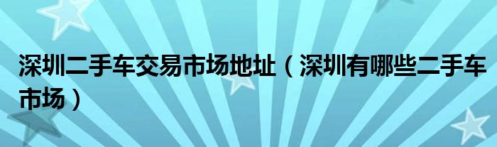 1、锦坤二手车交易市场,地址:深圳市龙岗区恒裕嘉城西北角;2、鑫宏业二手车交易市场,地址:深圳市盐田区沙岗圩66号;3、吉祥达二手车交易市场,地址:深圳市龙岗区吉祥南路与彩云一路交汇处东;4、捷诚二手车交易市场,地址:深圳市盐田区东海三街与永安北三街交叉口西北100米;5、和合二手车交易市场,地址:深圳市罗湖区桃园路与蜜园路交汇处西北。