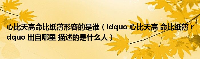 关于心比天高命比纸薄形容的是谁,ldquo 心比天高 命比纸薄 rdquo 出自哪里 描述的是什么人这个很多人还不知道,今天菲菲来为大家解答以上的问题,现在让我们一起来看看吧!