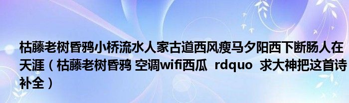 关于枯藤老树昏鸦小桥流水人家古道西风瘦马夕阳西下断肠人在天涯,枯藤老树昏鸦 空调wifi西瓜 rdquo 求大神把这首诗补全这个很多人还不知道,今天菲菲来为大家解答以上的问题,现在让我们一起来看看吧!