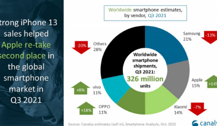 Canalys 发布了有关全球第三季度智能手机出货量的完整数据,这证实苹果重新位居第二,仅次于三星。7 月至 9 月期间共出货 3.255 亿台,与去年同期相比下降了 6%。出货量下降的主要原因是全球芯片组持续短缺。